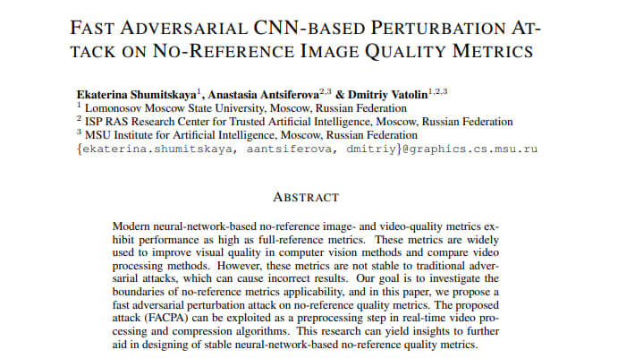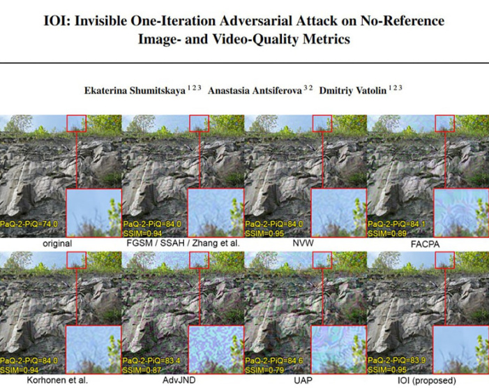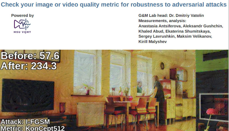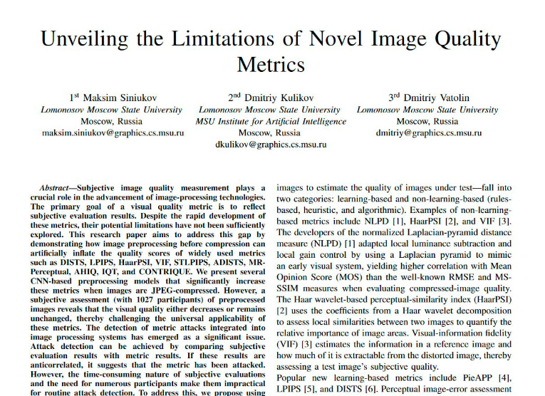 Субъективное измерение качества изображения играет решающую роль в разработке приложений для обработки изображений. Метрики визуального качества служат для аппроксимация результатов субъективной оценки. В связи с этим разрабатывается все больше и больше метрик, но их ограничения мало исследованы. Ученые Максим Синюков, Дмитрий Куликов и Дмитрий Ватолин в статье «Applicability limitations of differentiable full-reference image-quality metrics» рассматривают ограничения метрик качества изображений: они показывают, как предобработка изображений до сжатия может искусственно повышать популярные метрики DISTS, LPIPS, HaarPSI и VIF, а также то, что метрики не соответствуют субъективному качеству изображений. Они предлагают серию нейросетевых моделей предобработки изображений, которые увеличивают DISTS до 34,5 %, LPIPS до 36,8 %, VIF до 98,0 % и HaarPSI до 22,6 % в случае изображений, сжатых в формате JPEG. Субъективное сравнение предварительно обработанных изображений показало, что для большинства исследованных ими метрик качество изображения падает или остается неизменным, что ограничивает применимость этих метрик.